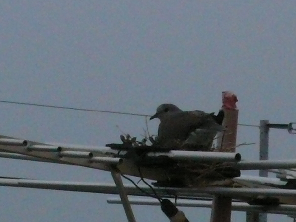 昨天...颱風輕輕掠過...雨水不如氣象局報導的傾盆大雨...反而是絲絲小雨....昨天中午的時候...我一如往常..在窗戶邊看著窗外的景色(雖然沒有什麼VIEW可言@@)........這時發現...挖咧..一隻斑鳩就在眼前....蹲在隔壁鄰居招牌邊的電視天線頂端...腳邊有一窩枯草...應該是鳥巢吧..真是有夠...(這位大娘...你築巢的位置好尷尬捏@@...要是下大雨怎麼辦阿= =)